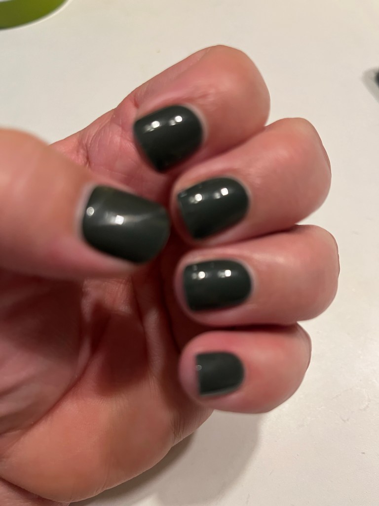 After letting my nails stay naked for about 3 days this time to give them a break, I applied “Pine for You” and it’s a really dark green. I love it! As I am writing this post, I am on day 5. So, since I started my press on journey again, I have had grey that lasted 7 days, black that lasted 8 days, and aqua green that only lasted 4 days. I still don’t know why the aqua started popping off, but my theory is that the sticky was old because I applied them the same way. I think you have better outcomes with trimming them and keeping them shorter, too. I didn’t notice that the set on the right was wider fit, and I don’t really need that, so I gave those to Erica because she has a wider nail bed.