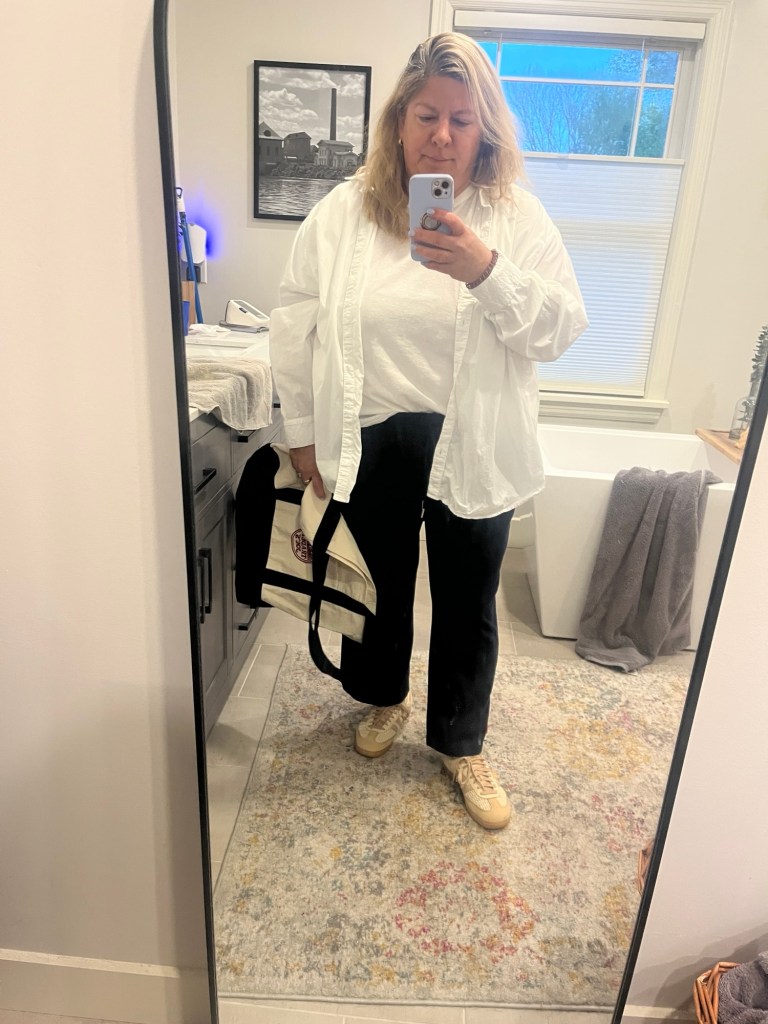 I wore this last week for an early morning errand. You can’t see from the photo, but these are my Land’s End track pants. I sized down and should have sized down another. I wore my Adidas Sambas (I have gotten my money’s worth), an Old Navy plain white tee, and my Aerie white button up.