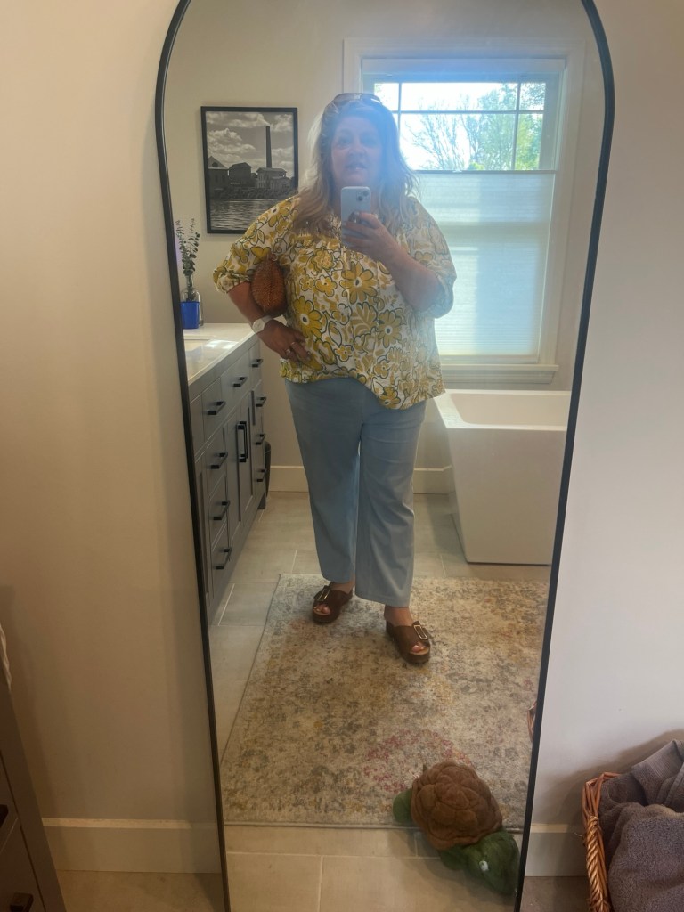 I wore this for mah jong on my patio followed by a casual pizza dinner out. I have on my straight leg Halaras, Kork-Ease sandals, and my Umgee yellow and green floral blouse.