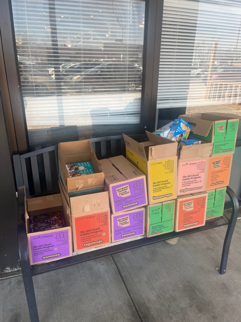 I think an employee’s daughter is a Girl Scout. They just had all these boxes of GS cookies sitting outside on a bench. I love that we are pretty trusting around here. I did send Tom a photo saying “I know where you can get some Thin Mints” and he replied “Free Girl Scout cookies with every French tip” and it had me wondering how he knows that nail style.