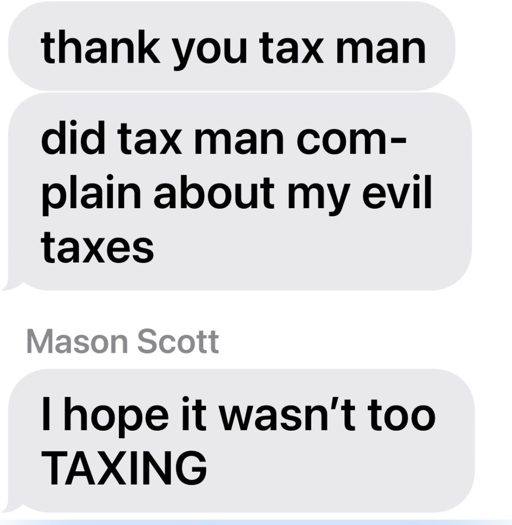 Tom usually just does our taxes on Turbo Tax and this year we hired it out and did our whole family plus my mom’s final taxes. She was alive for 28 days of 2025.