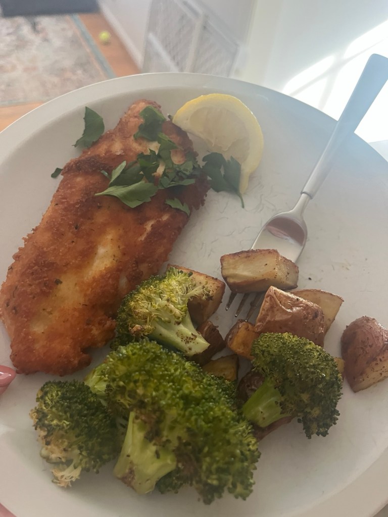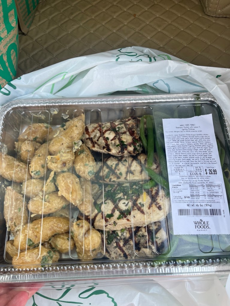 I had heard about the Whole Foods family meals. Many youths are using them as “meal prep” and dividing them up in portions. I got the rosemary chicken, green bean, and lemon potatoes. It was $26.99 and made 6 meals for us. I sent a portion home with Mason and Tom and I had it for dinner twice and I had it for lunch once. They also had a salmon, broccoli, and sweet potato version but it was a few more dollars. My friend is taking one to a person who had surgery.