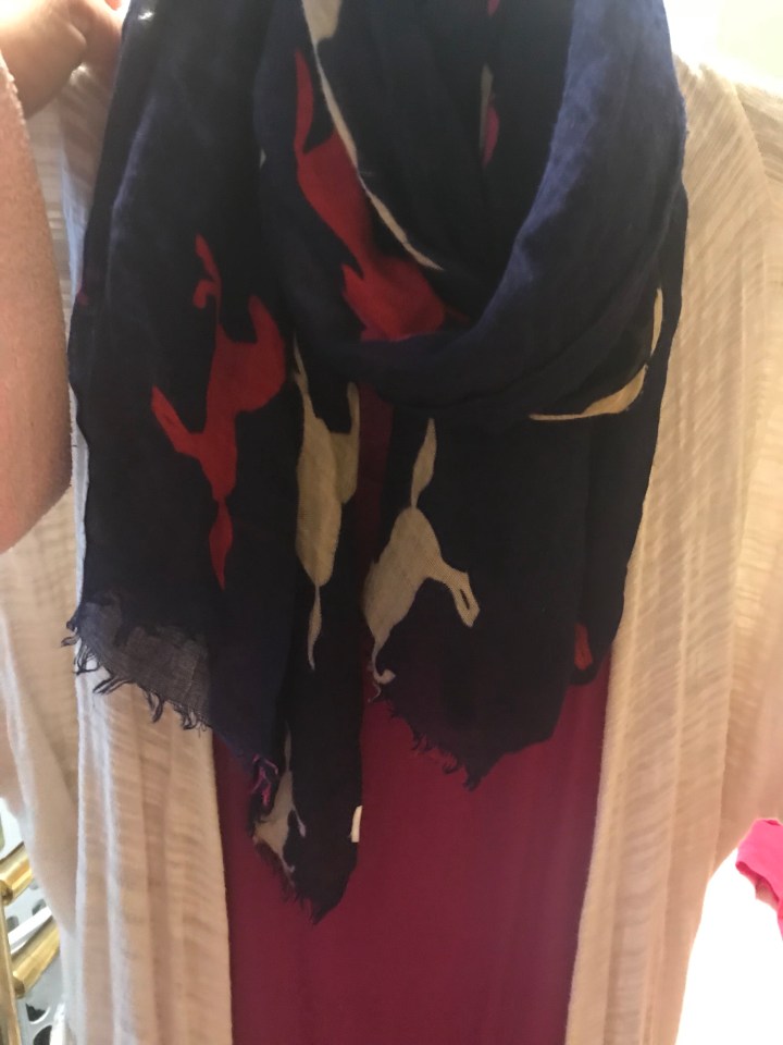 Wednesday’s outfit is a magenta swing dress, a cream knit cardigan, and one of my two horse scarves. It is Derby week in Kentucky and I like to break out my horse scarves. They are very lightweight. I wore my black and white one last week and this past weekend to the art fair.