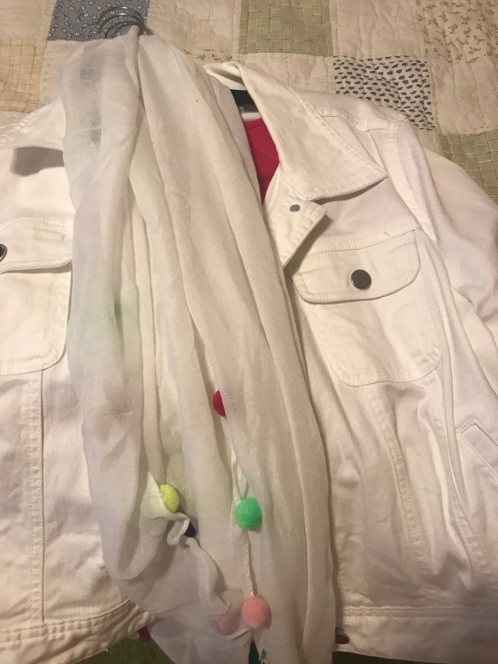 This is a hot pink swing dress with a white jean jacket over it and my pom pom scarf that I was going to wear on Tuesday. I discovered the hot pink dress has a stain and I’m afraid it’s permanent. I will try to work on it.