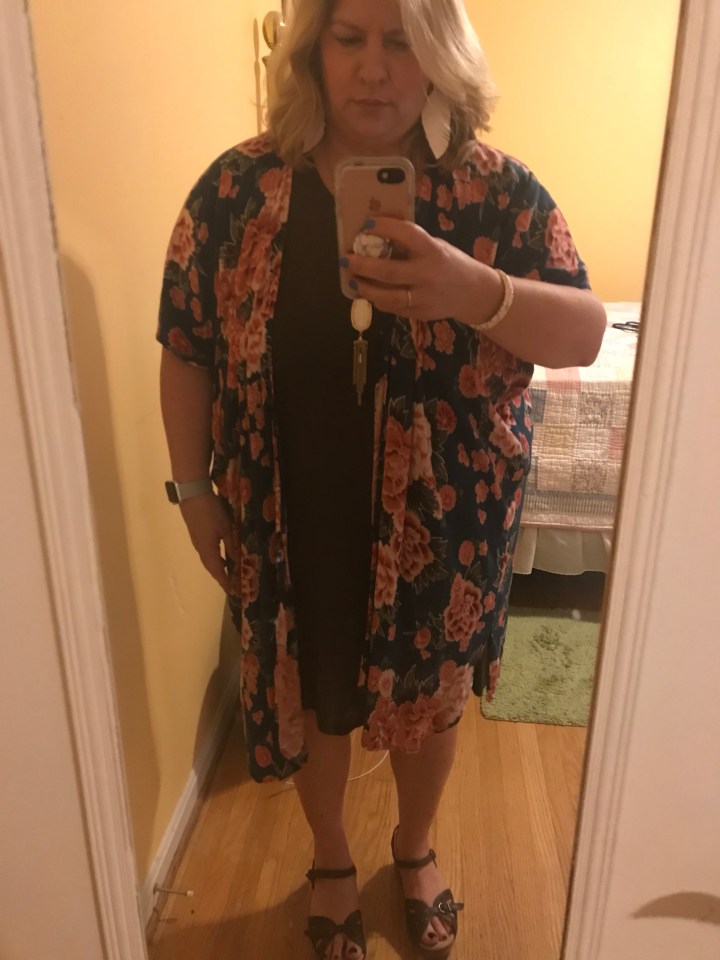 Tuesday – I wore an army green swing dress with this really long kimono which I promise also had army green in it. It’s not that flattering but it was comfortable. I’m wearing teacher Dansko sandals. I need recommendations on teacher comfortable shoes that are in style. I think these look clunky!