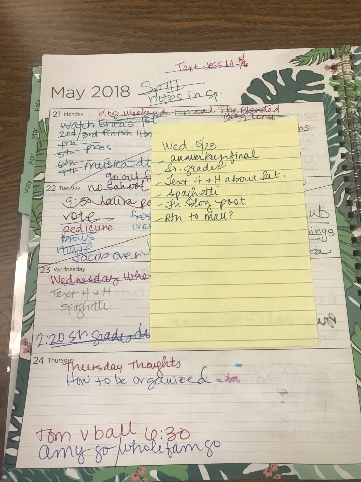 I love my iphone and keep lists on it for all types of things – take out ideas, movies I want to see, things we need from Costco, birthday days, etc., but I use a paper calendar to stay organized. When a new month is coming up, I look at the entire month and see what birthdays and holidays we are celebrating, and any other special things that month. I start thinking of gift ideas, place orders, go to Dollar Tree for cards one Saturday when I can. On Sundays, I look at the week ahead and meal plan and see what will be happening that week.