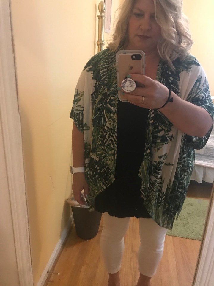 This is what I wore. It was time to put on some “real” clothes! This kimono can double as a cover up (from my post on coverups). I am still on my walking streak except for a break Saturday a.m.