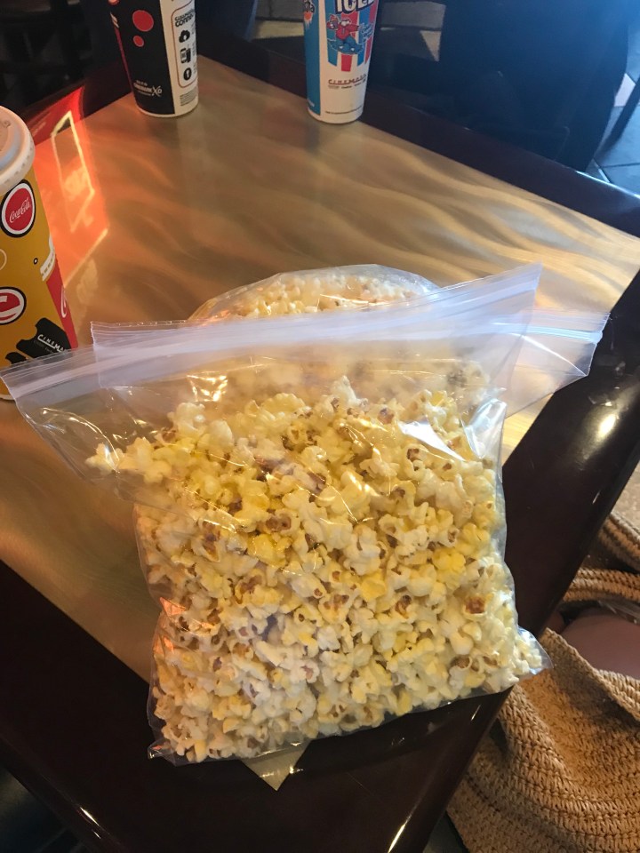 Let me tell you how we have to do the movies…my husband loves the movies and must have popcorn and we buy the refillable bucket and bring our own giant baggies so we can share the bucket between the four of us. It’s a spectacle, I tell you!