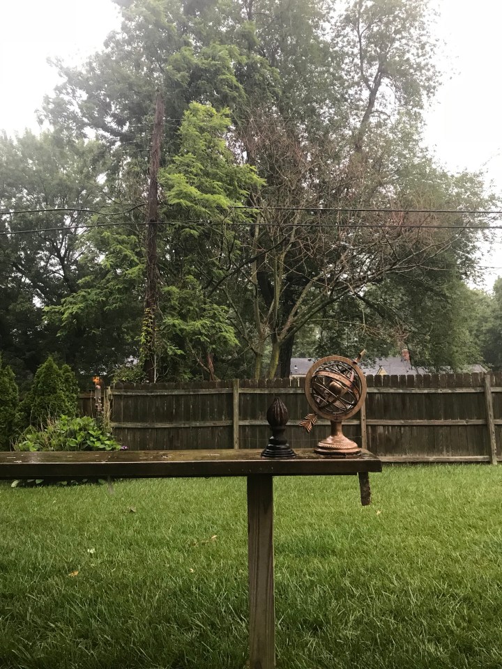 Wednesday morning brought more rain and here I’m giving you a different view of my backyard.  Try to ignore the power lines.  I still enjoy my coffee on the patio unless it’s storming.  I really try to embrace this morning  ritual because I just can’t do it when school starts.