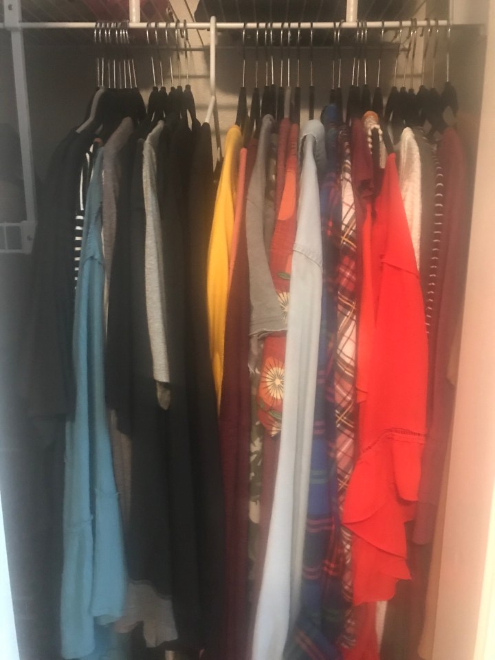 Our weather is still all over the place here in Kentucky.  We had fall like temps last week and now we are back to high 80s.  Here are the shirts that I can wear over the next month or two.  Notice there really aren’t that many.  And, notice they are not really organized by sleeve length but somewhat by color.