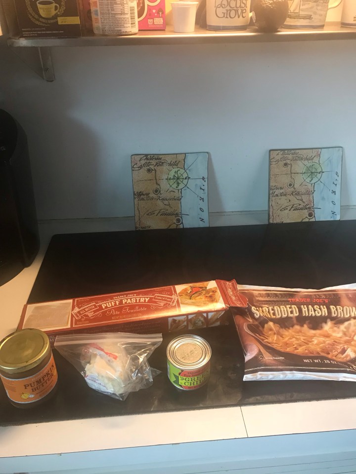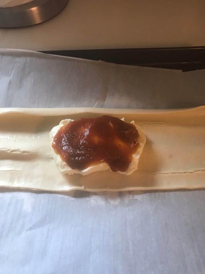 Brie with pumpkin in puff pastry – let your puff party defrost for about 30 minutes on counter then roll out. I used a half a sheet only. I just cut it. Add a small thing of Brie in middle. I smushed it down and took off white rind. Add a couple of spoonfuls of pumpkin butter on top and then wrap puff around and I tried to make it shaped like a pumpkin! Brush with egg white and bake for 20ish minutes at 350. You could do quiche and Brie at same time. People, this is a keeper! I’m putting this on my Thanksgiving list to make for one or both of our family gatherings!