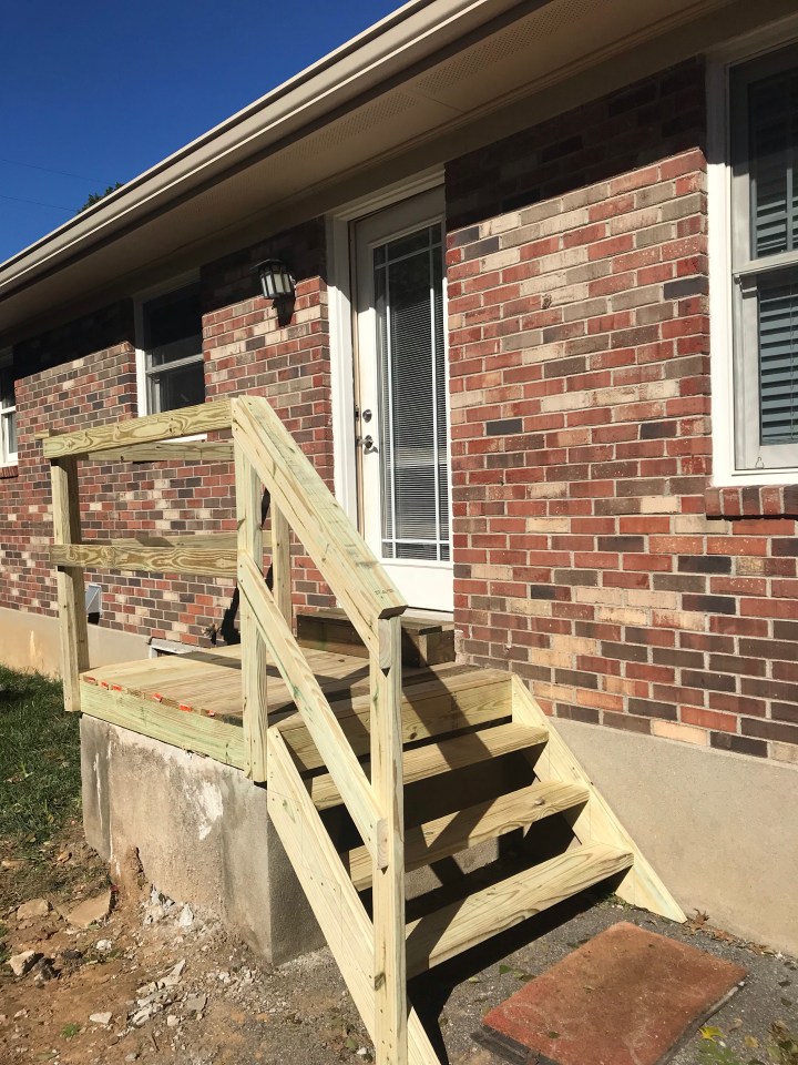 My husband built us temporary back steps in just a few hours each weekend day. I was without back steps for only five days but I learned how much I needed them! Look at that deceiving blue sky. It was 50 degrees!
