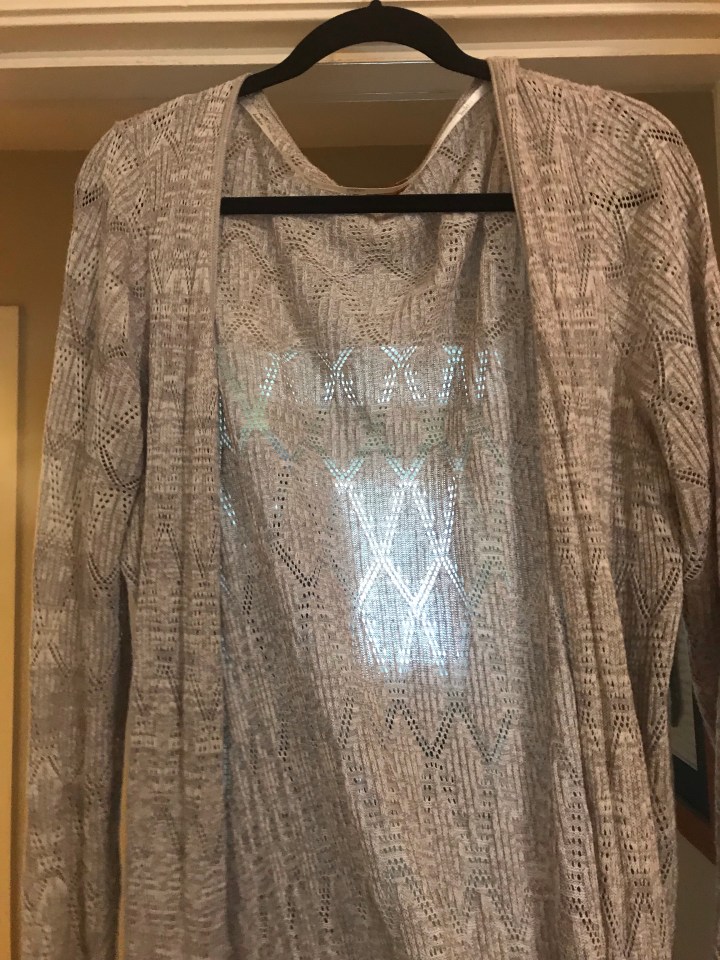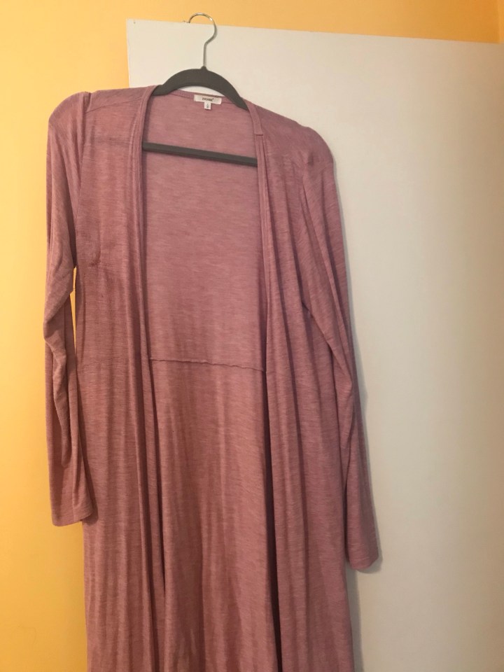 I currently only have two long cardigans – a mauve T-shirt material and a grey crochet knit sweater.