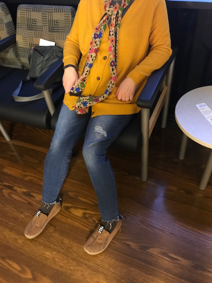 This sister looked cute in her step hem Stitch Fix jeans, last season Target mustard sweater and crocheted scarf. She is an art teacher and has a cute and funky style. She is not doing Stitch Fix anymore but splurged on these $80 jeans and has worn them a bunch. She thinks the price point is too high for her to do it regularly, but I know many people who think they actually save money by doing it. It’s that theory of having fewer things but things you truly love and that fit you well. Hmmmm, I’m still doing research on that!
