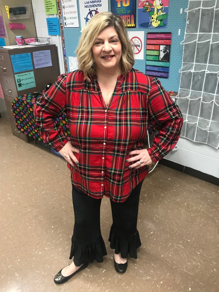 Tuesday’s outfit: ON plaid tunic length shirt, Matilda Jane velvet, Tory Burch flats.