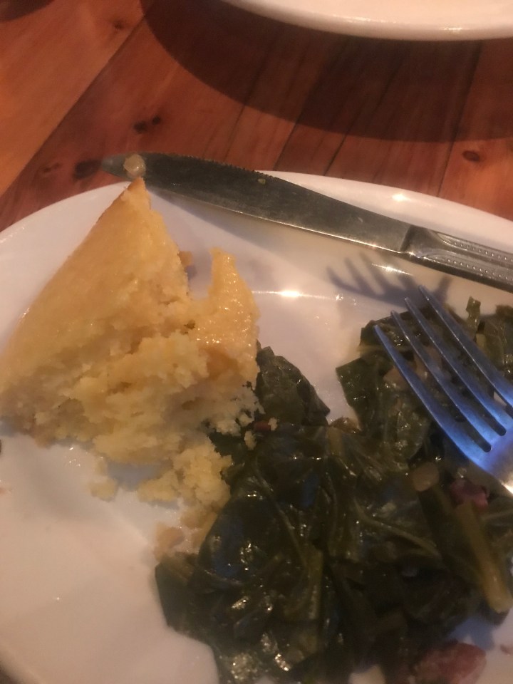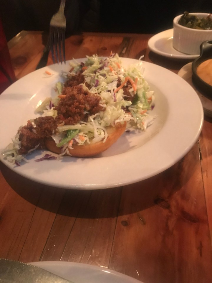 In keeping with my trying to squeeze in some husband time in the midst of my current situation with my mom living with me and my dad in the hospital, hub and I stopped at this place on our way to visit at the hospital and bring my mom home.  It is on Bardstown Road and has a nice atmosphere.  We should have ordered the fried chicken which they are most known for, but we ordered sloppy joe, spoon bread, and greens to split.