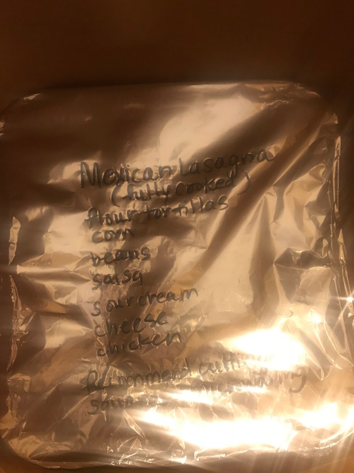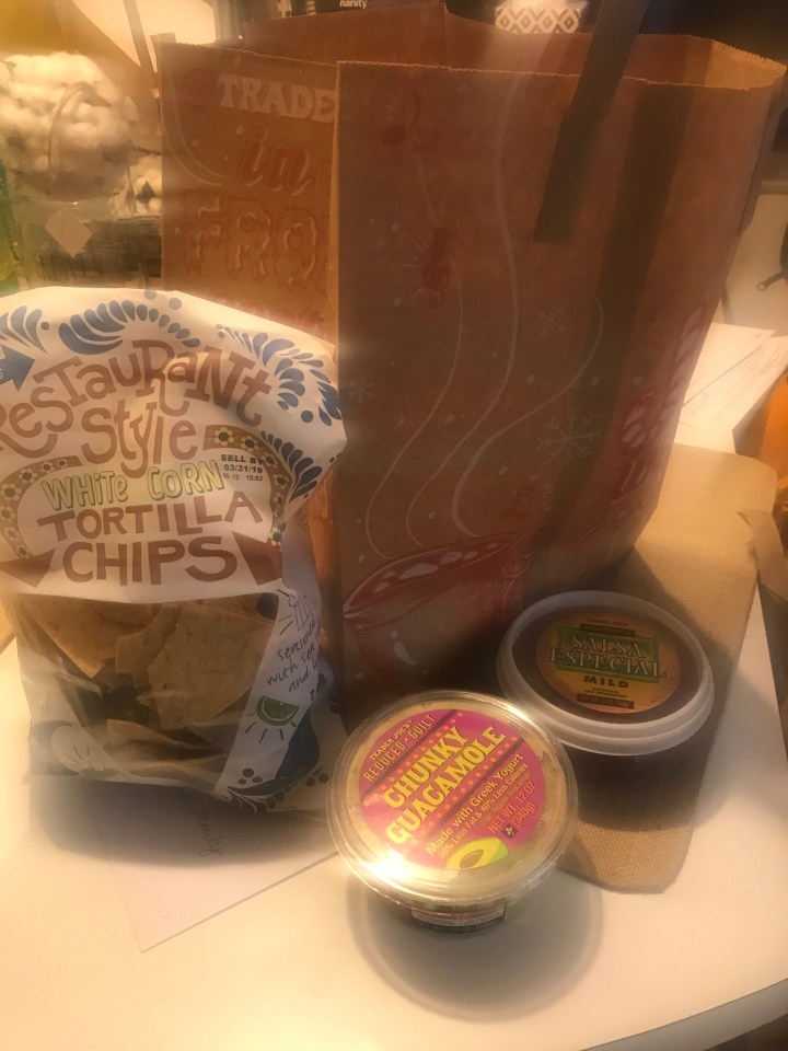 Tortilla chips, salsa, guac, Mexican lasagna, brownies and a sticker book for the 3 year old older brother!