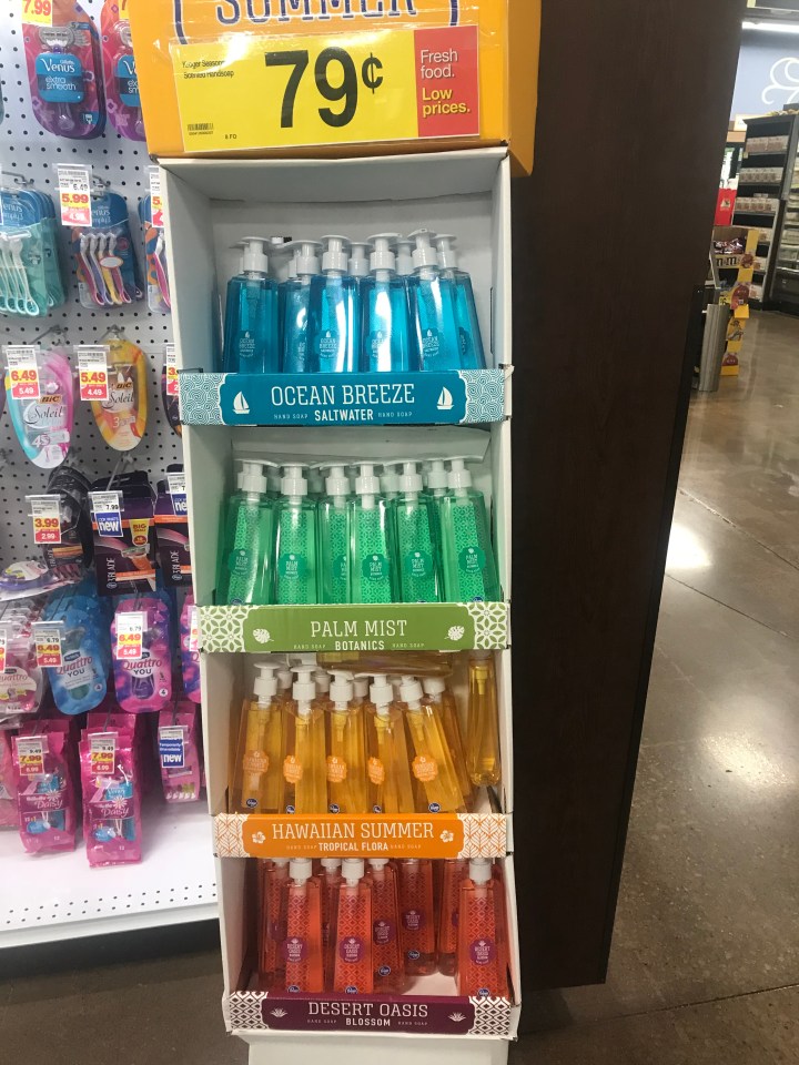 -Recently I gave up my Bath and Body habit. I was spending way too much for candles I didn’t need when I already had several and the soaps are really expensive even when you do their deals. These are my Kroger’s spring scents. I bought 4 for the price of one B and B soap.