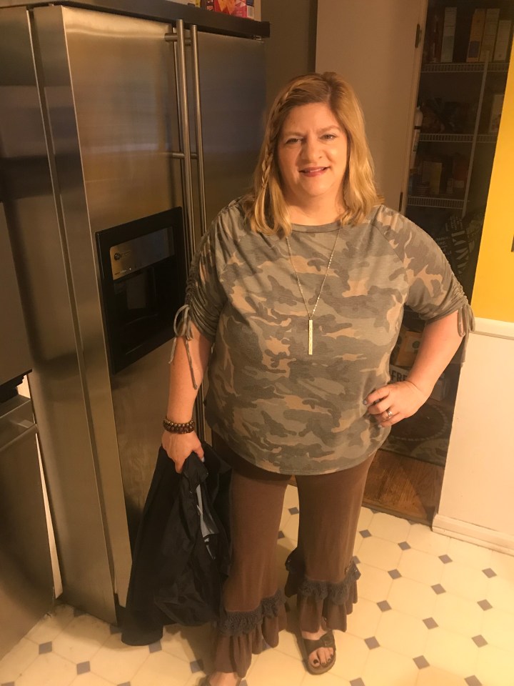 This was a rainy day last week thus the garage picture. I’m loving my new Amazon Soda black sandals. I’m wearing my consignment Chico’s pants (yes, I wear these almost every week, they’ve been to Europe with me, and I’ve had them for maybe 6 years now and I purchased them for $10), my Loft tassel sleeveless blouse, and my TJ Maxx kimono. One of my red earrings broke at the end of the day so I want to find another red earring. I like how the tassel and earrings matched.