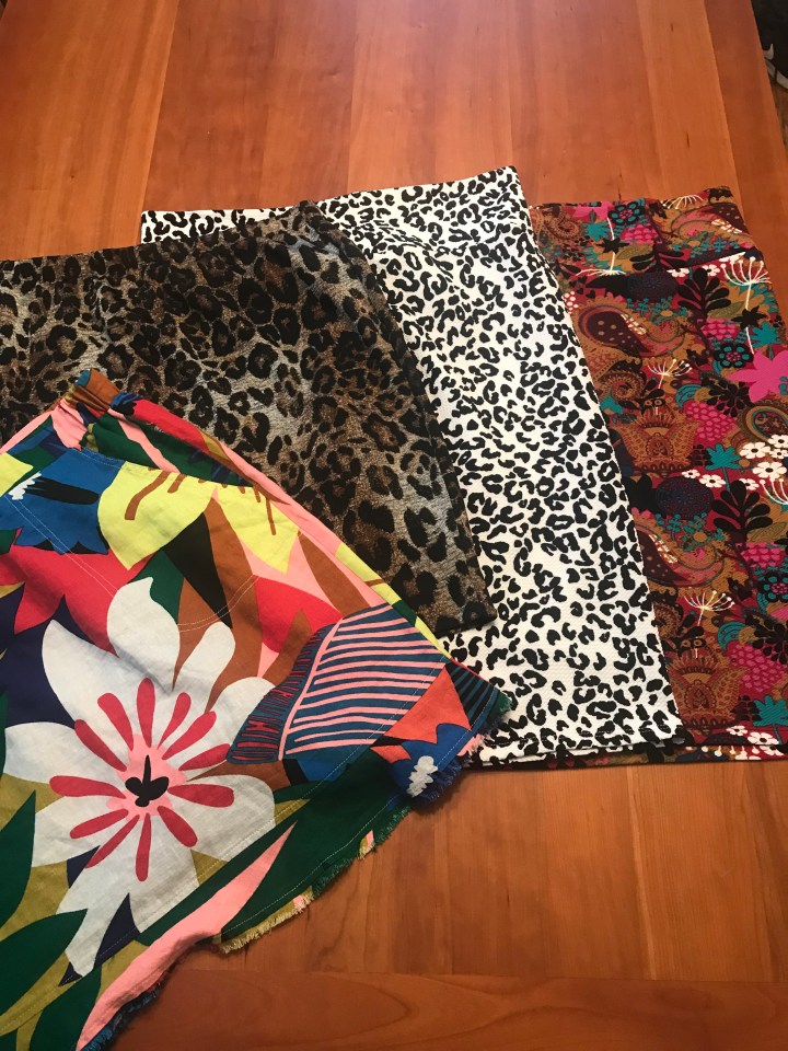 The one on the left is the only one new this season – from Steinmart and it’s a linen type material so does slightly wrinkle, the leopard is from Chico’s, and the black and white jaguar is another Cassie.