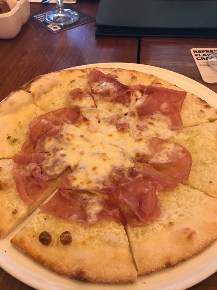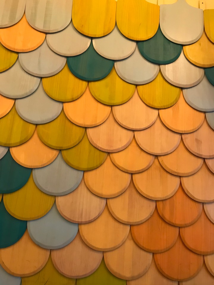 These are pizza paddles painted (say that three times fast!) and on the wall at the restaurant – so pretty!