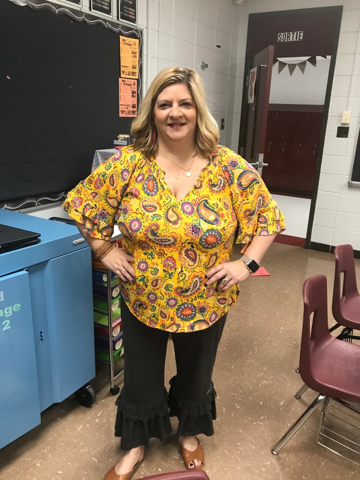 Here is a outfit from last week when it was still 90 degrees.  I am wearing my consignment blouse by Democracy and green Matilda Jane pants which were also consignment.  I am wearing my Target Universal Thread slides that have really been great for school!