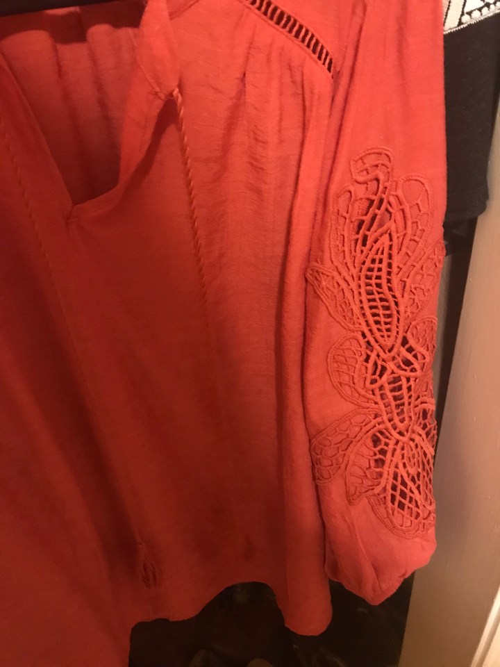 I also popped into TJ Maxx to get a birthday gift and found this nice coral/orangey linen? top for for me for only $16 and bought it.  It is a perfect fall color but lightweight top like I talked about here.  I also thought the sleeve detail was super pretty.  I did have to wear a nude cami underneath but it did not make it too hot.  It looked like a much more expensive top so I was so happy to get it for such a good price.