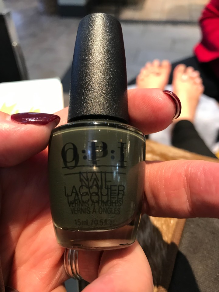 I got a green/grey called “Things I’ve seen in Aber-green” by OPI. I am still considering a dark green for my next manicure so I think this will coordinate.