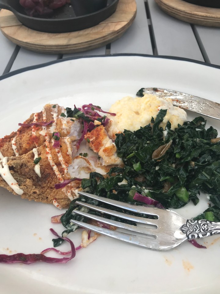 We opted to sit outside because the night was so nice. We shared the brussels sprouts and hush puppies with our friends and then Tom and I split the Catfish. I thought it was excellent!