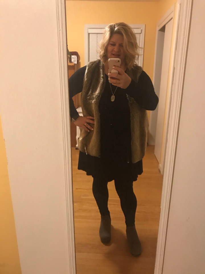 School outfit – leggings, swing dress, faux fur vest