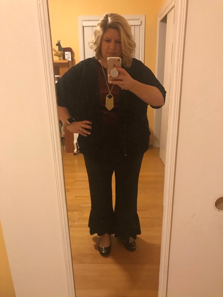Dinner out at at Mexican restaurant – Hue jeggings, Sanitas clog booties, black top, leopard sweater/kimono