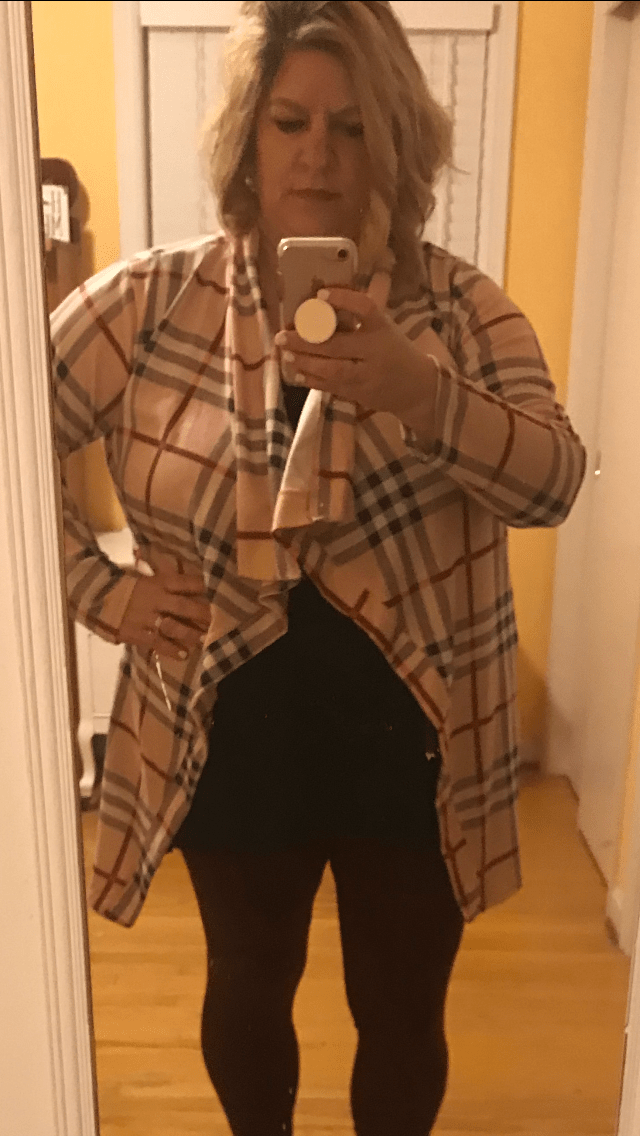 School outfit – leggings, black top, pink ¨burberry plaid” sweater