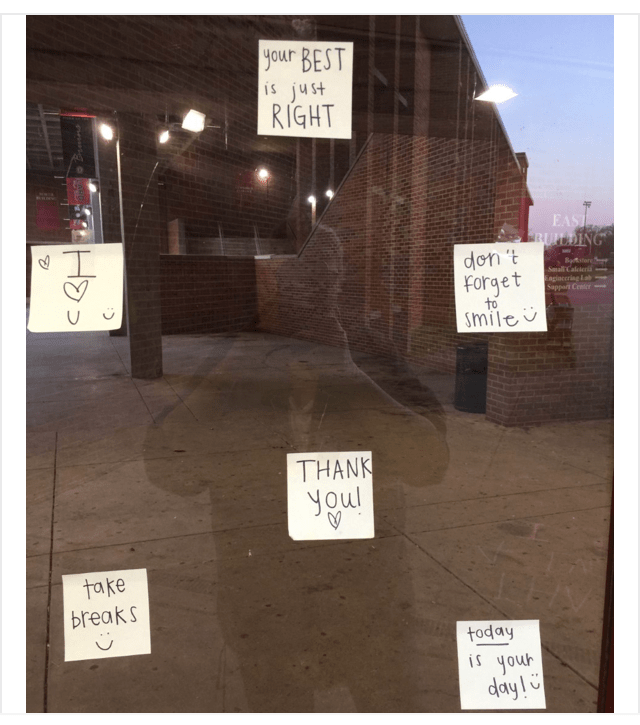 A custodian sent us this photo – a group of students had left us notes of encouragement all over the building and chalk messages on the sidewalks. I was so touched!