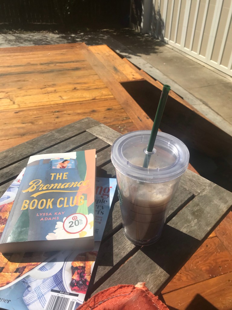 I went to my basement desk and worked for an hour grading the work from last week and entering it in our grade system and then came outside to enjoy an iced coffee and read.