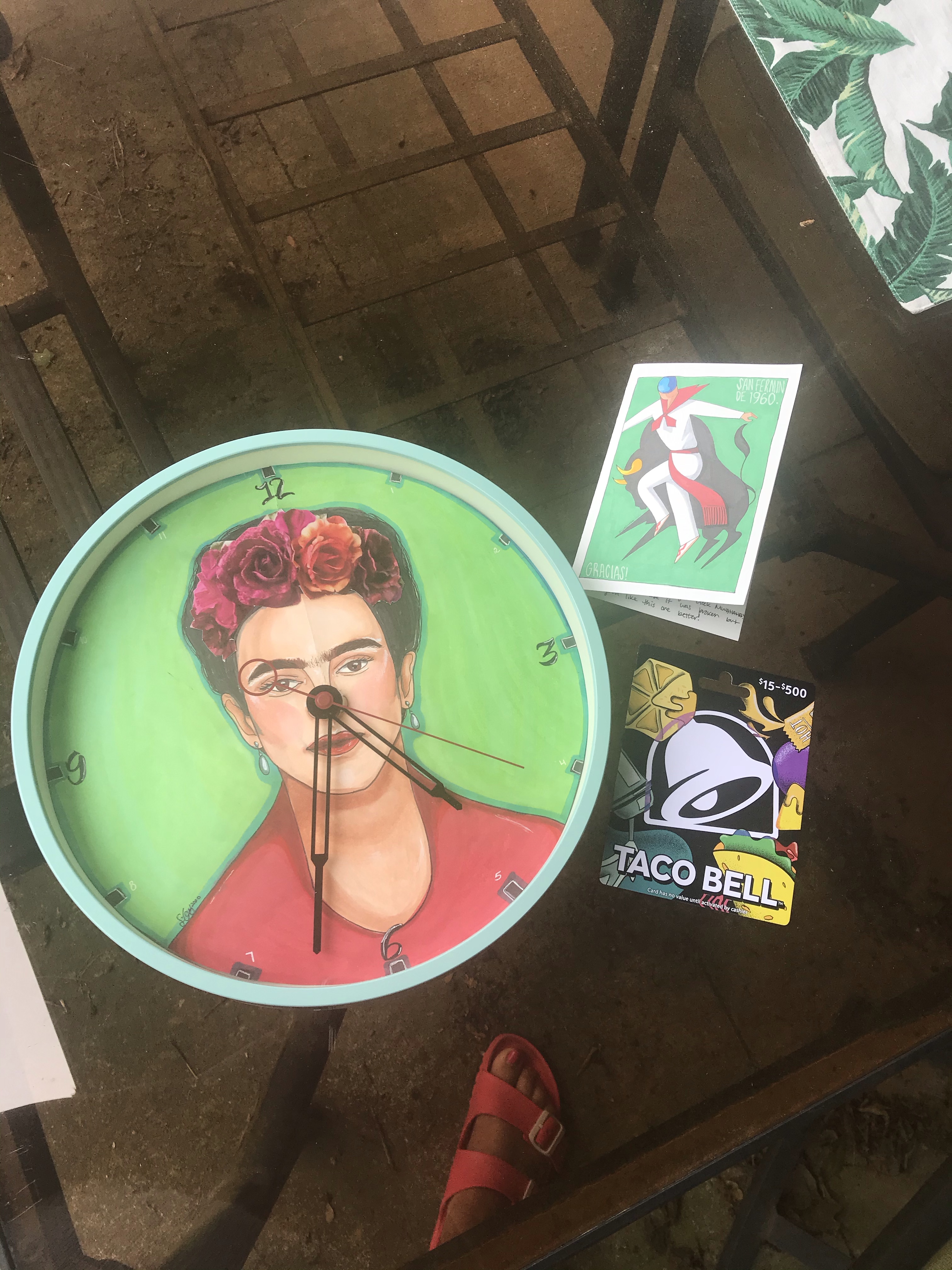 I had a surprise delivery from one of my dear senior girls. Several years ago, a senior started a tradition of stealing my classroom clock. Then they would return it on the last day for seniors. They stole it this year and she painted Frida Kahlo on it! If anyone steals this next year, they all fail! She also gave me a Taco Bell gift card (lol) and a handpainted card of the running of the bulls with the sweetest note inside. Awww!