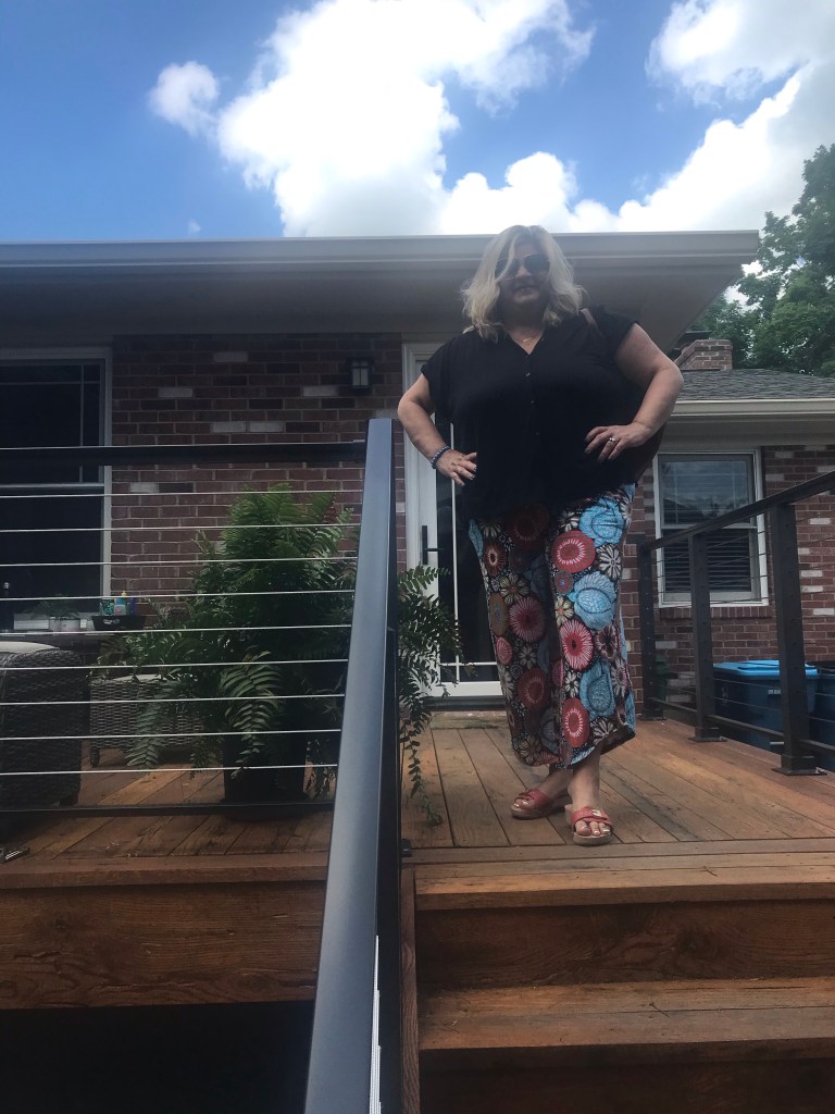 This is not a good angle. Mason is my photographer and we are trying to figure out lighting and locations. But, again I wore the simple Loft knit button down and my Loft knit pants. I fell in love with the print a couple of summers ago.
