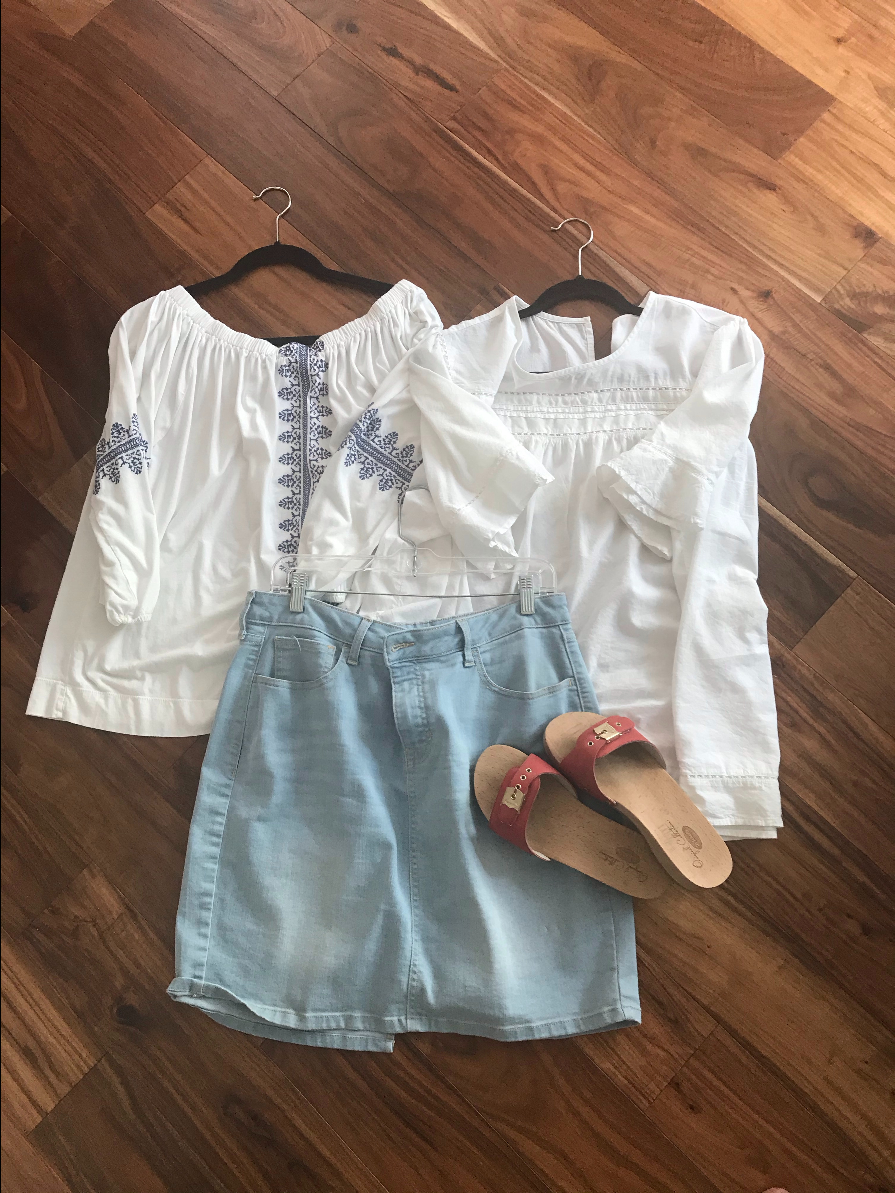 I love my light denim skirt from Old Navy a couple of seasons ago. I could wear this plain white blouse from Old Navy this year or this knit embroidered blouse from Kohl’s several years ago. I am not a big fan of Kohl’s, but I do love both the navy tie dye above and the embroidered top below. They are both the Chaps brand. I find this brand to be of good quality.