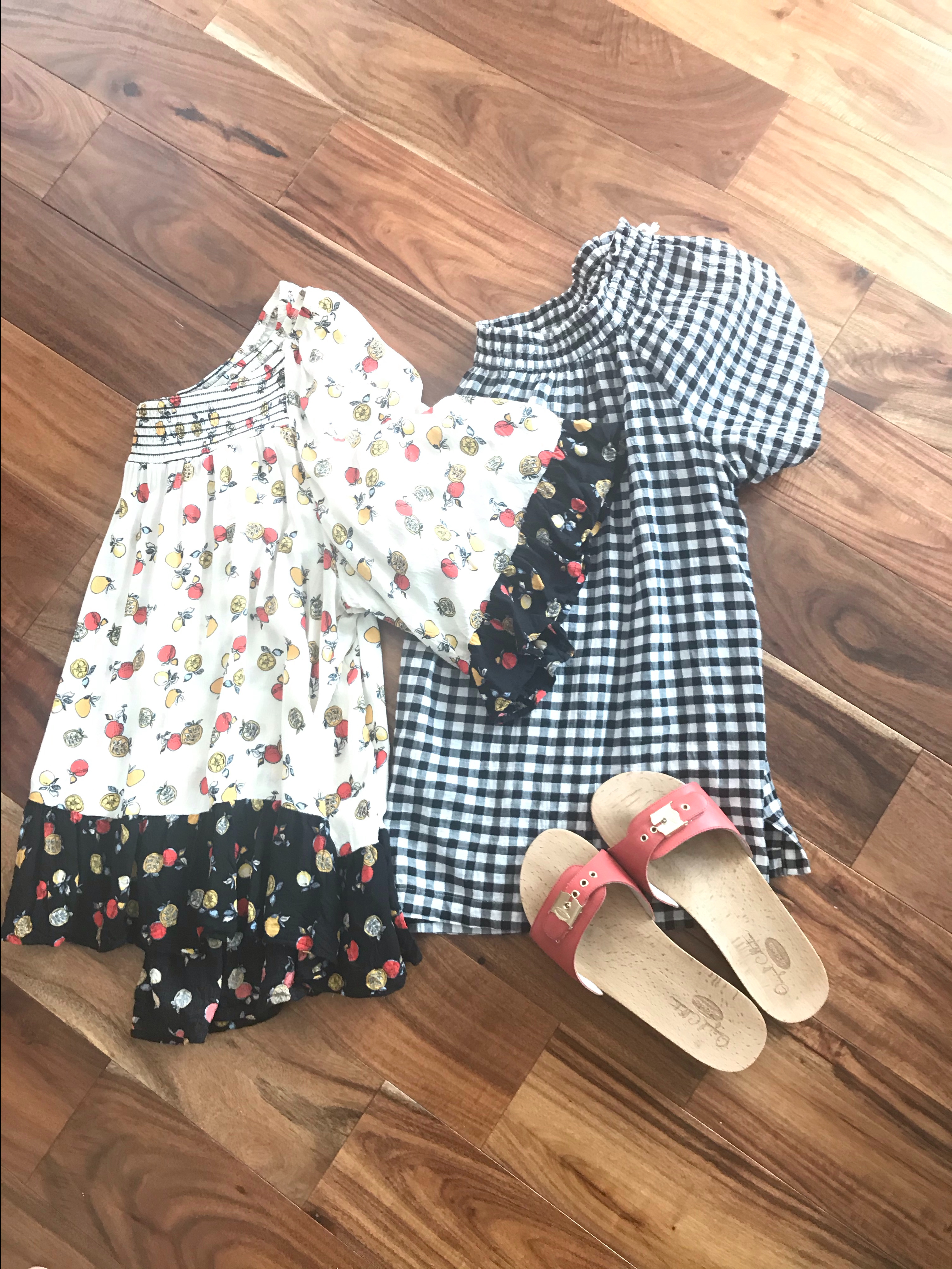 I thought they would also look cute with my black and white gingham blouse – old from Loft. I love this fruit blouse from the brand Democracy that I found at Steinmart last year.