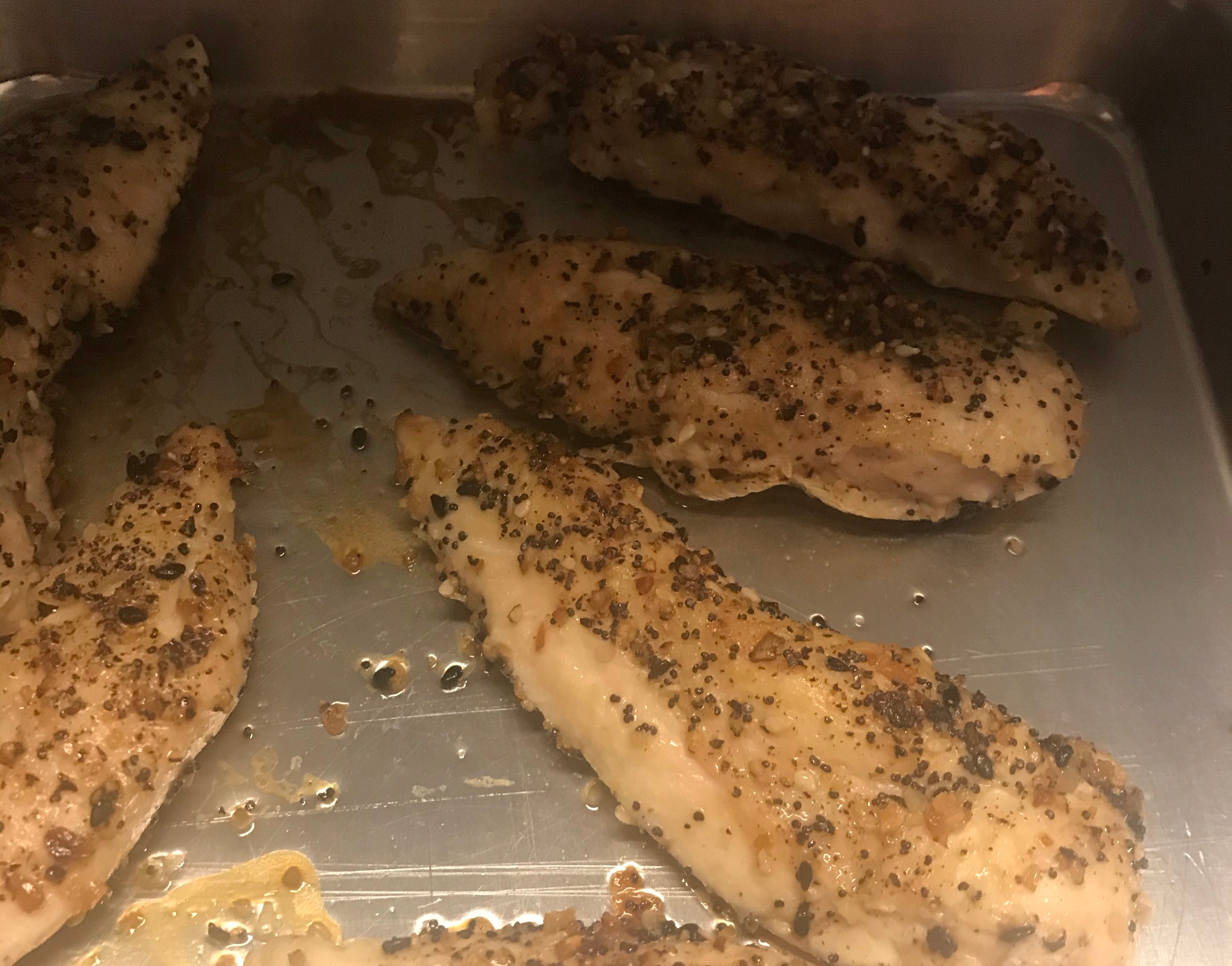 Season chicken breasts or tenders on both sides generously with Trader Joe’s lemon pepper and everything but the bagel seasoning. Sear on both sides for 2 minutes and put in a 400 degree oven for 20 minutes. Thank you to Carolina Charm for this recipe! She also just posted that she used this to make chicken salad (the cold version with mayo, etc.)!
