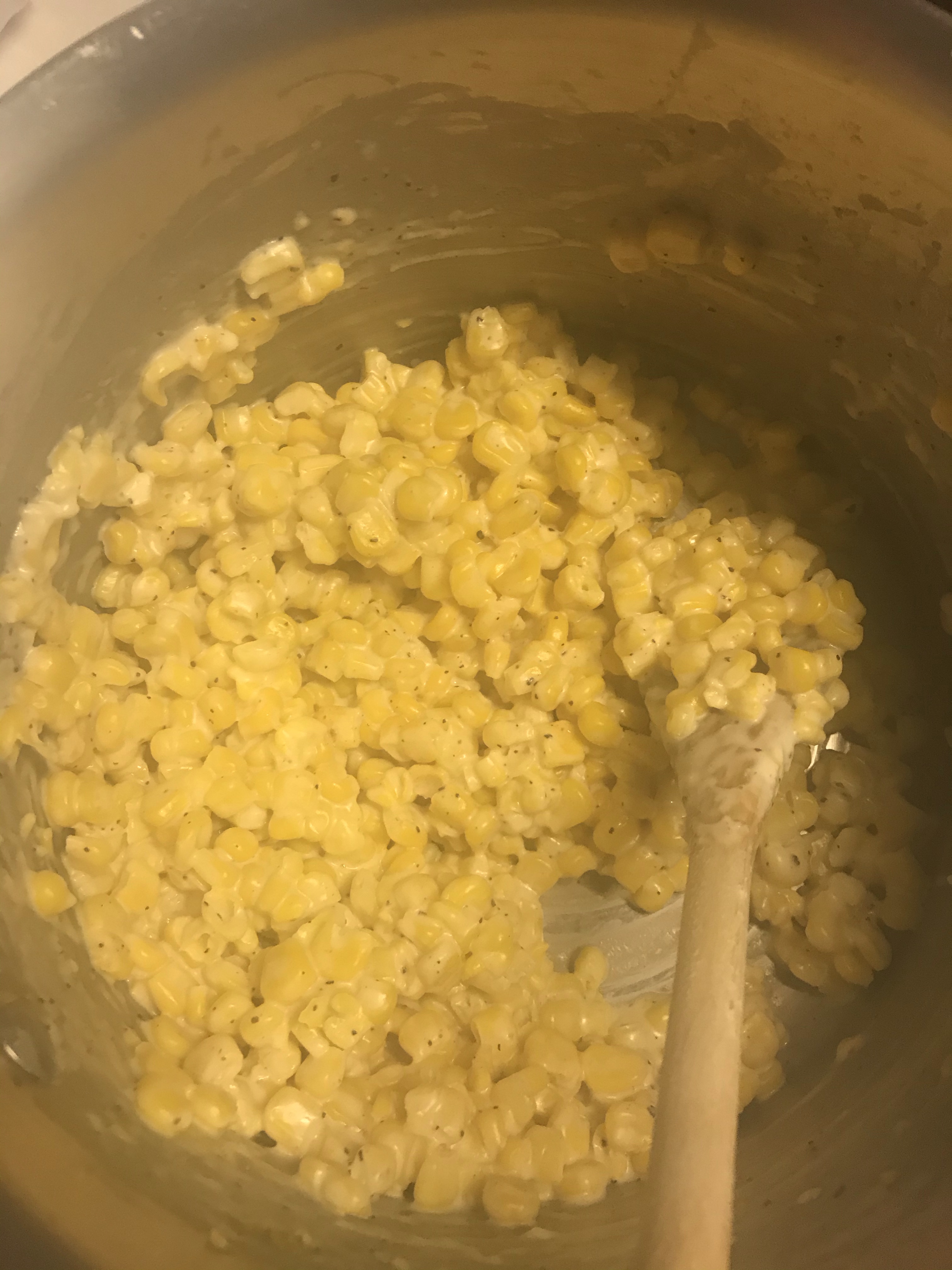 I also wanted to make this corn from Boo Mama. It has cream cheese and sour cream. It would’ve been a better meal with a green vegetable instead, but we were low on supplies.