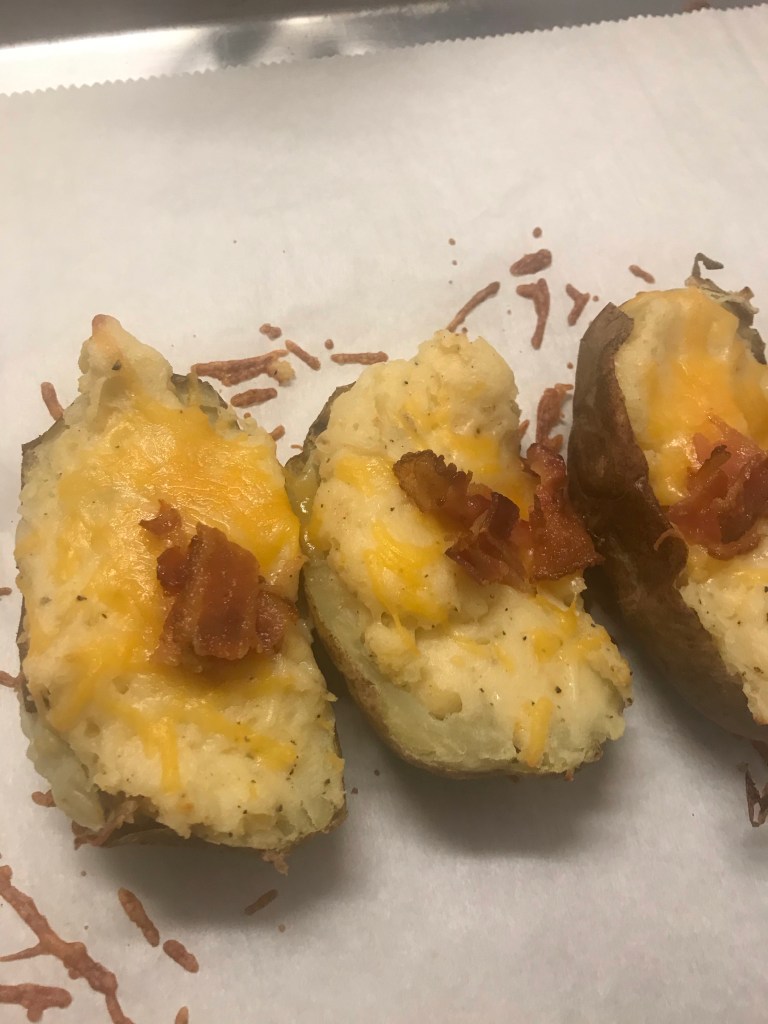 I served this with shortcut twice baked potatoes. I did two potatoes in the microwave then after they cooled a bit, I split them in half and scooped out the innards. I added sour cream, cheese and spices and put back in the potato skin and added cheese and bacon and baked for about 15 minutes in the still hot oven.