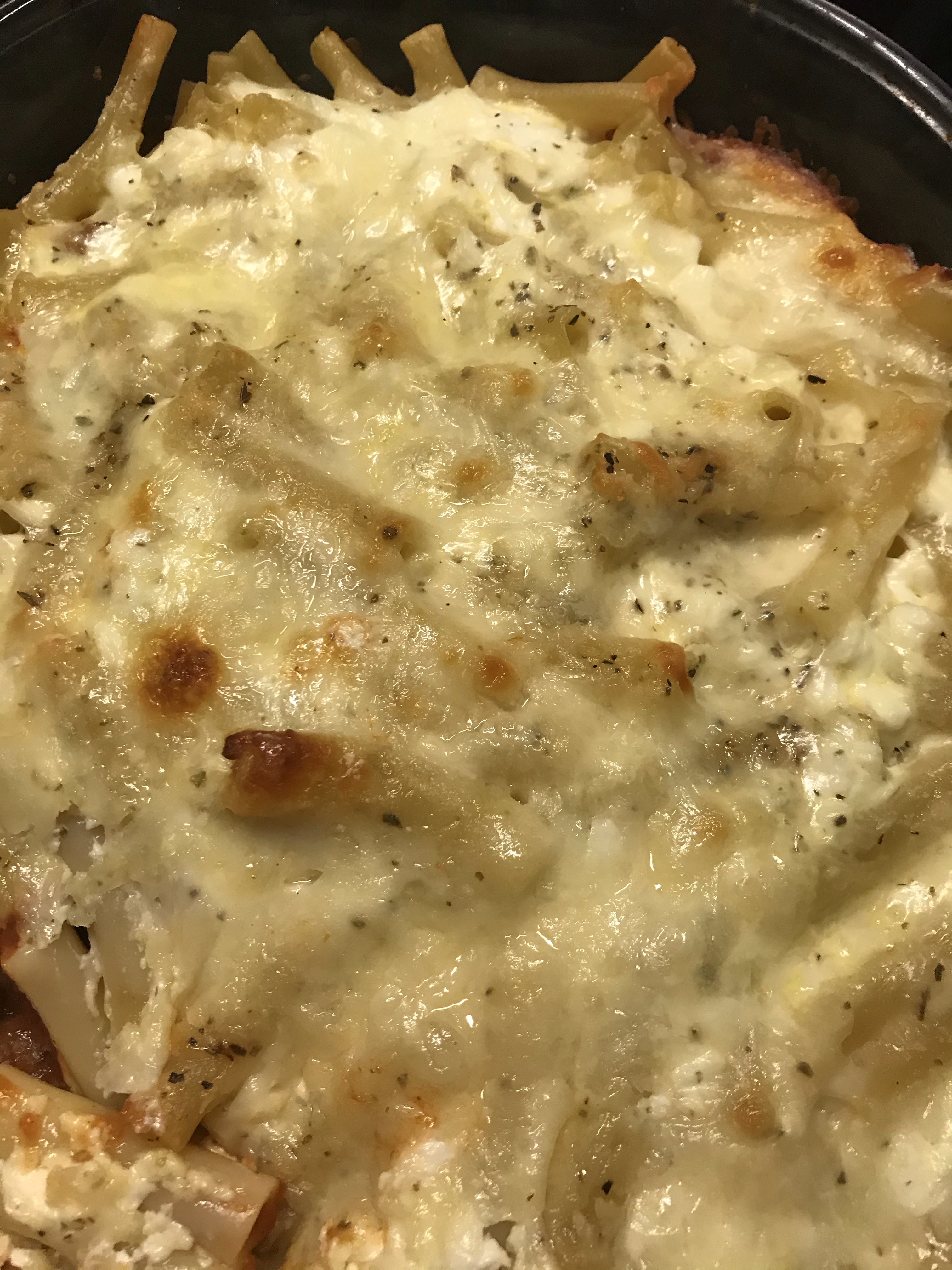 I made Family Savvy blog’s baked ziti for a crowd but I didn’t make as big of a portion.