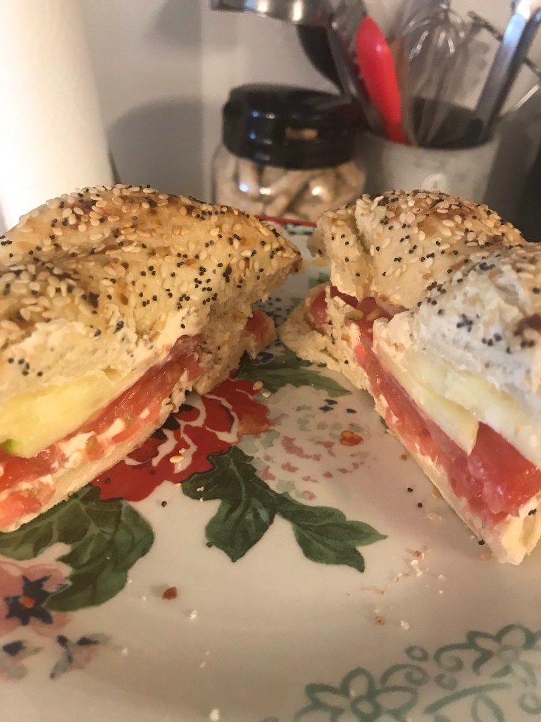 I love, love, love veggie sandwiches and look for them on many menus. I re-created the veggie I used to get at our beloved bagel shop that went out of business. This is simply a Trader Joe’s everything bagel, toasted, with garden vegetable cream cheese, sliced tomatoes, and sliced cucumbers. You could add more vegetables if you wanted to.