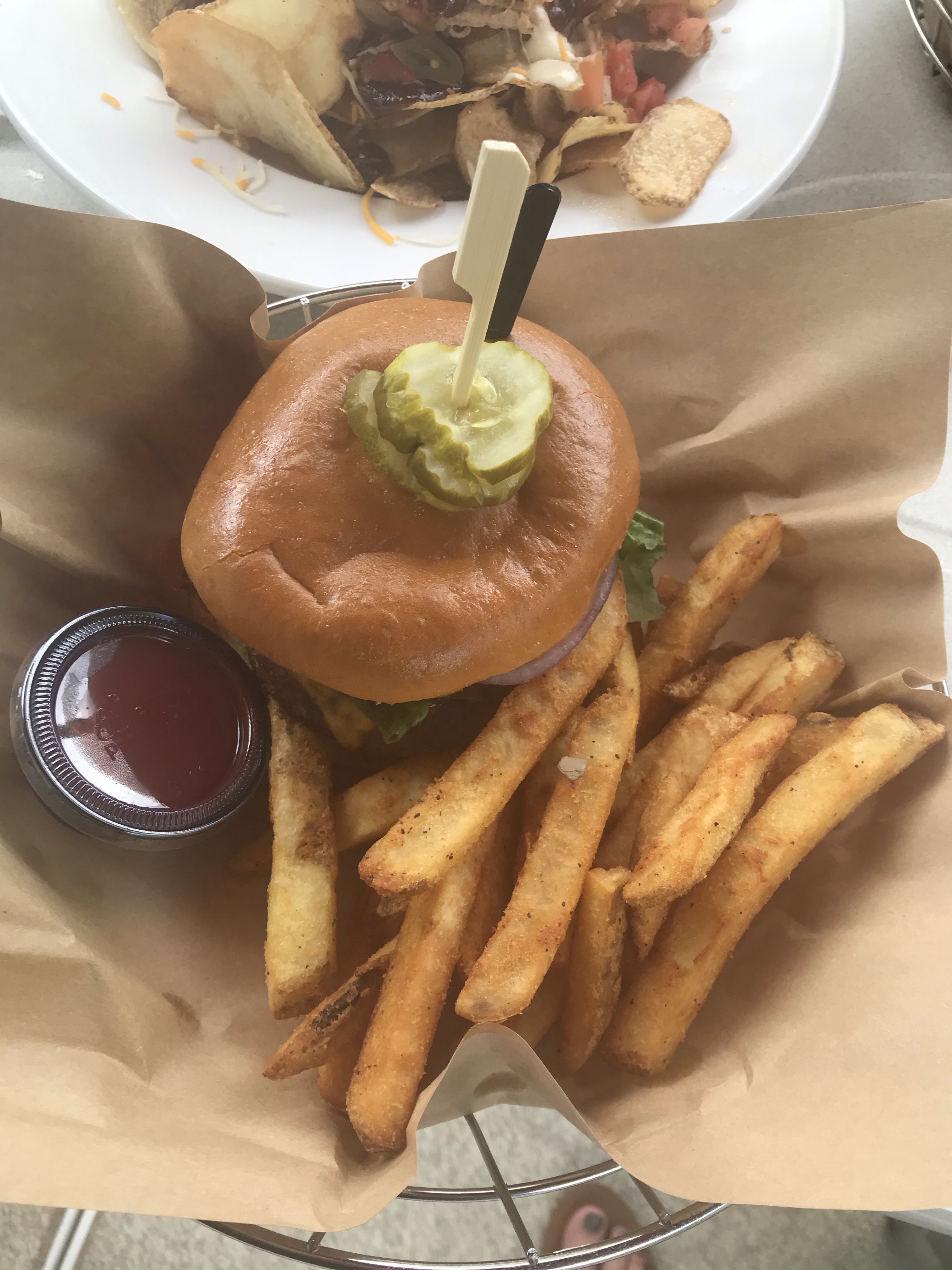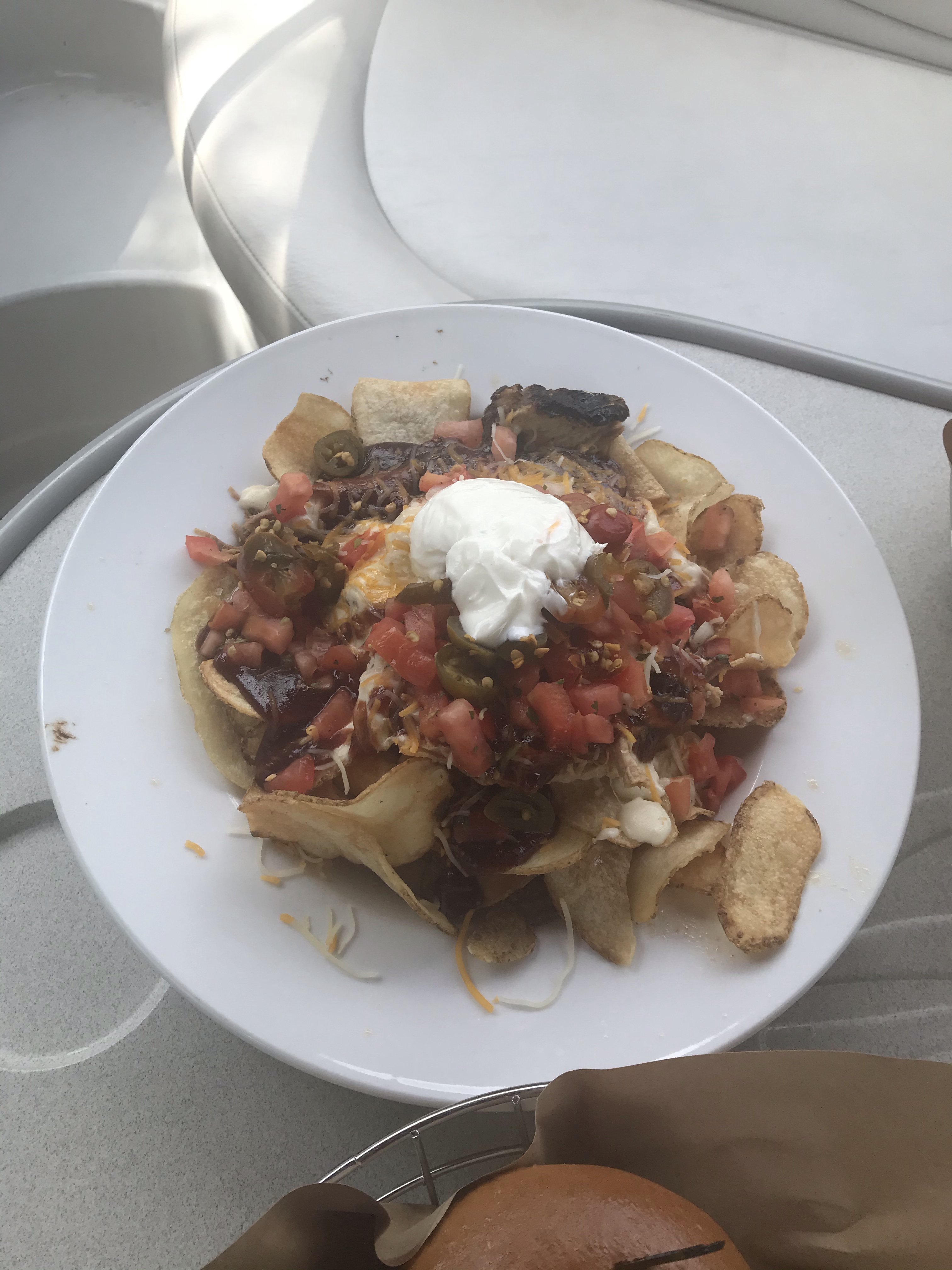 Tom got pulled pork nachos on homemade potato chips.