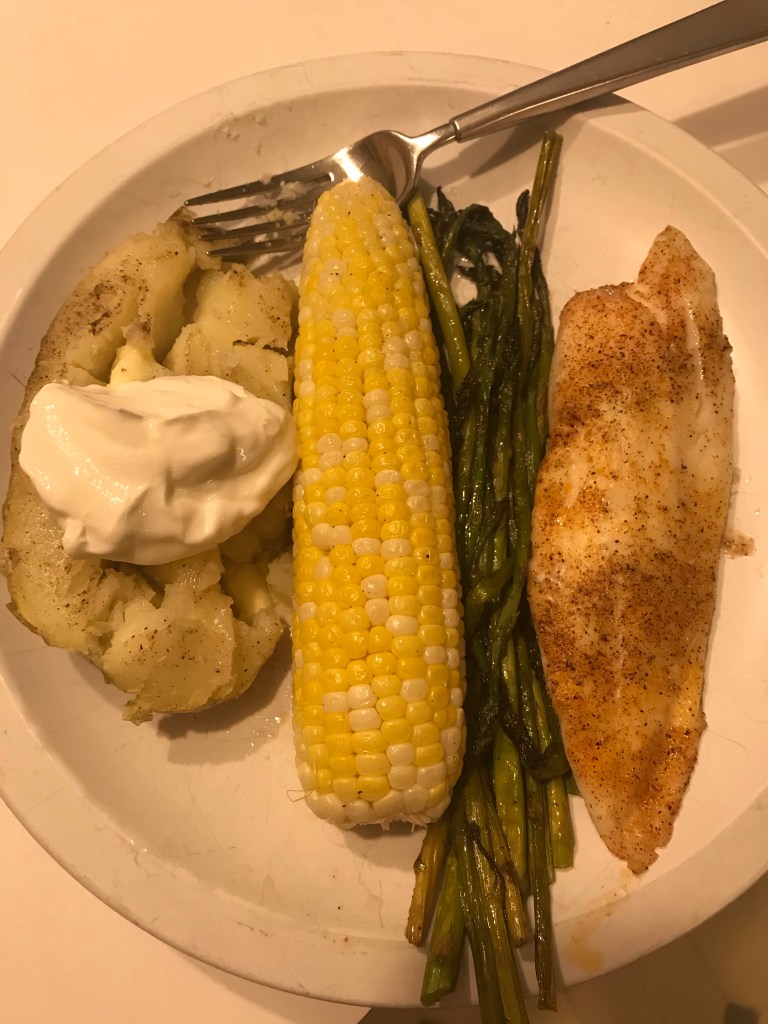 oven baked cajun tilapia, corn, asparagus, half a baked potato.