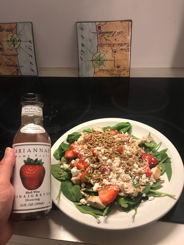 Strawberry salad – grilled chicken, spinach, goat cheese, strawberries, sunflower seeds