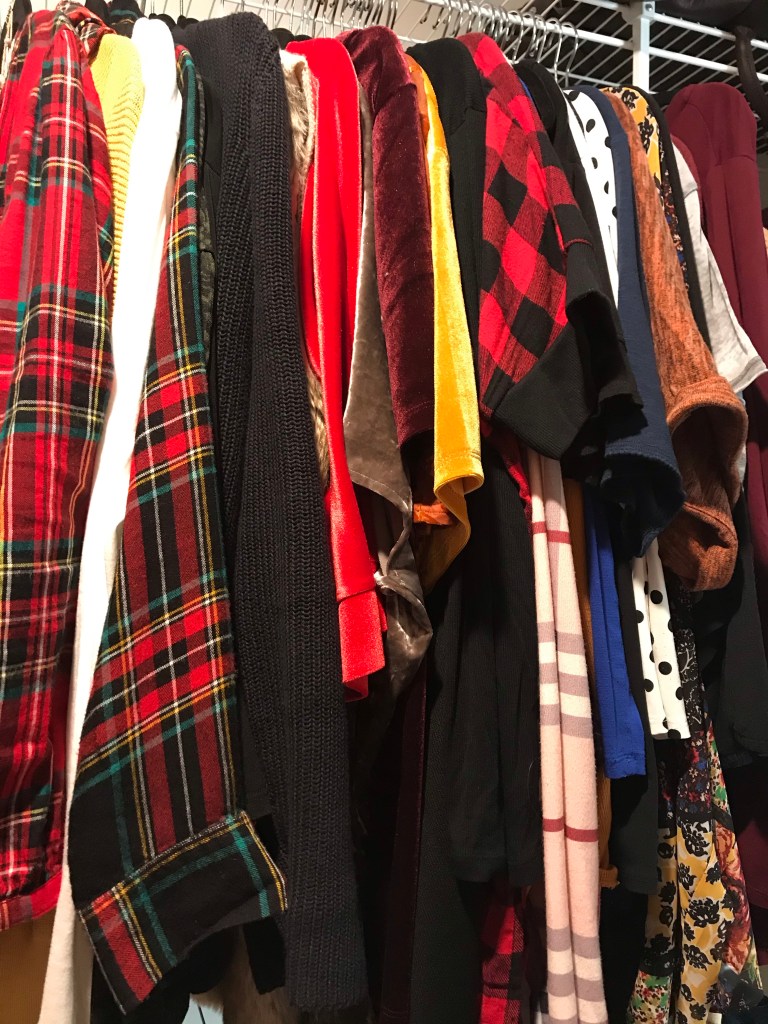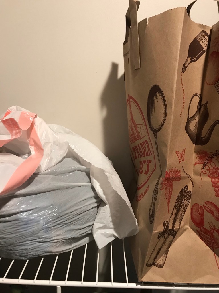 I keep a bag for donation and re-sell in my closet at all times. The trashbag is always donate and the Trader Joe bag is to take to Clothes Mentor next time I go. I have not gone in so long.