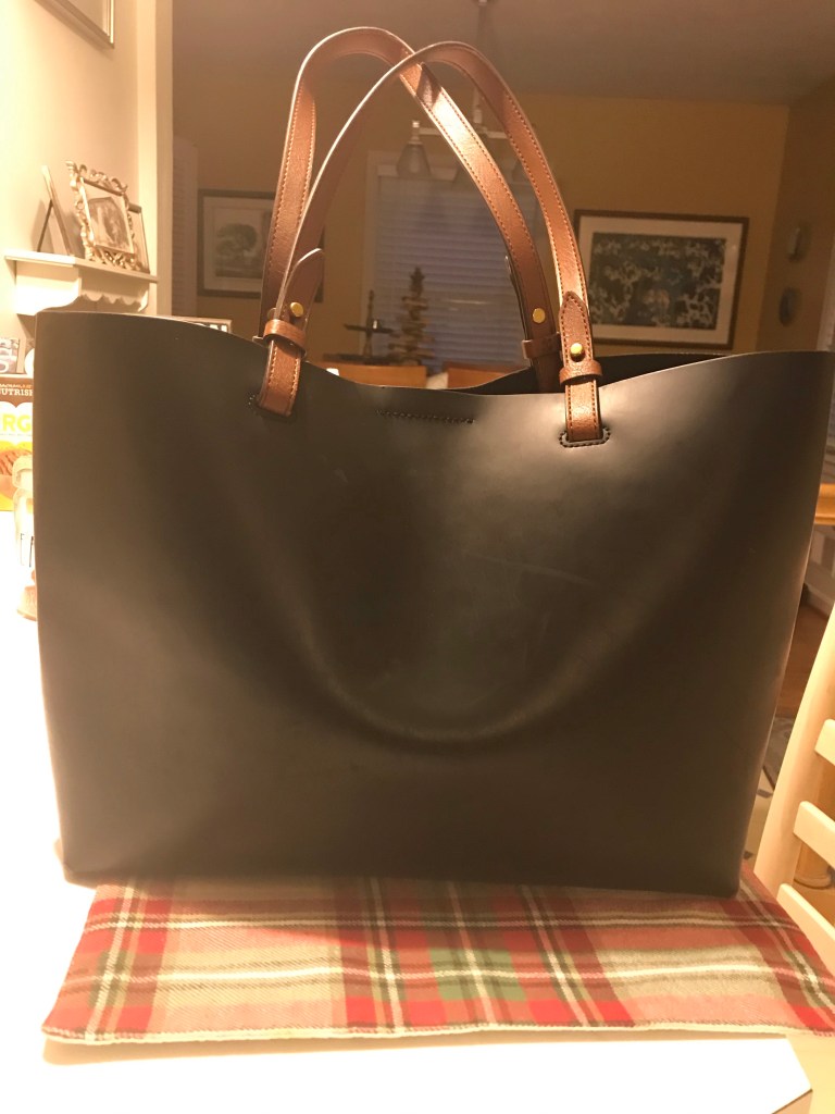 This is one of my favorite purses. It is Fossil and I think it is rubber. I like the black and brown combo. Fossil is a really good brand with great quality and a good price point. I do not work for Fossil, but I am not sure I have ever talked about this bag.