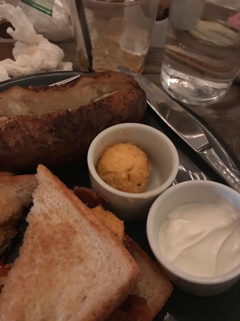 Saturday night we went to eat in a heated tent at a new southern style restaurant with our friends. We got deviled eggs and grit fritters to start and they brought us pimento cheese cornbread.