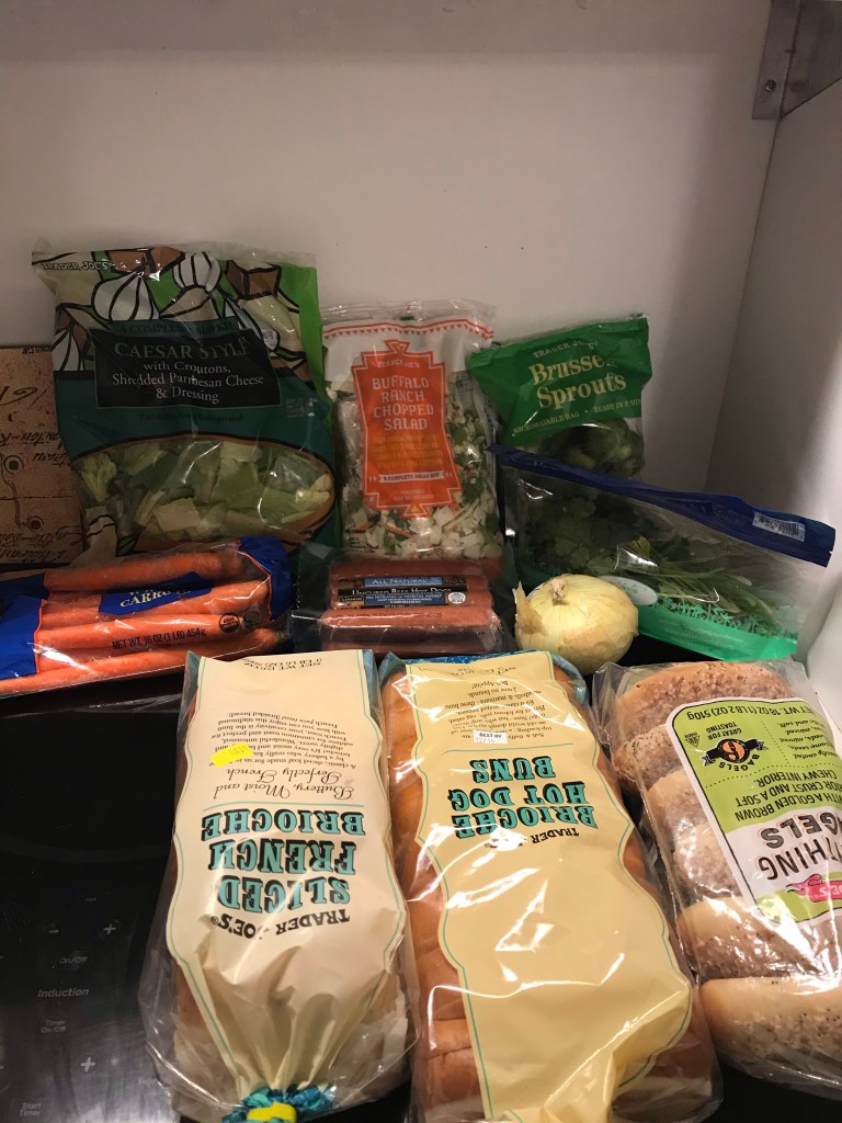 And, then I got a Ceasar salad mix, a buffalo salad mix, brussels sprouts, cilantro, carrots, hot dogs, onion, brioche to keep in freezer for French toast and FT casserole, brioche hot dog buns (fancy!), and the everything bagels that I keep in the freezer. I also got my favorite jasmine rice for the freezer.